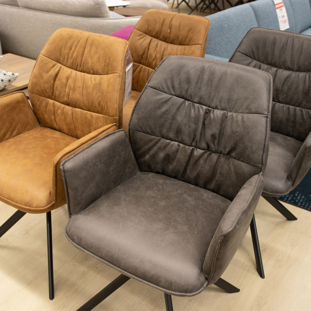 Uitgevoerd in stof Fandy, kleur Cognac en donkerbruin. Voorzien van zwart metalen poot met terugdraai functie.