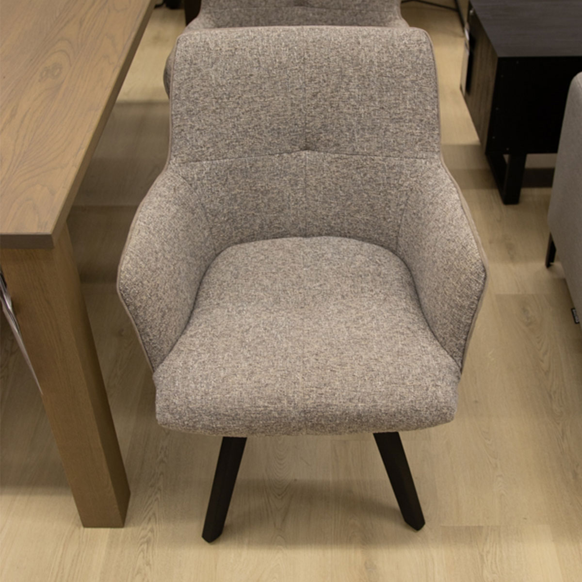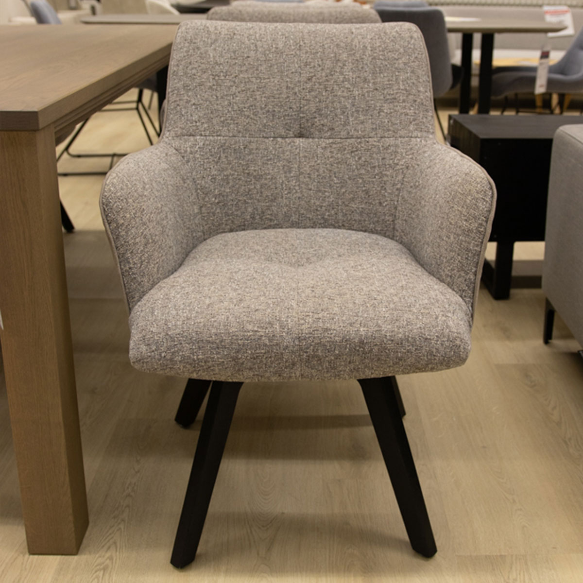 Uitgevoerd in stof oasis 91-bisque (voorkant) en microleder boxer 84-clay (achterkant) met zwarte houten autoreturn-draaipoot.