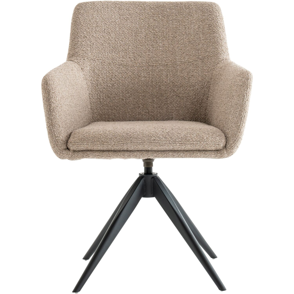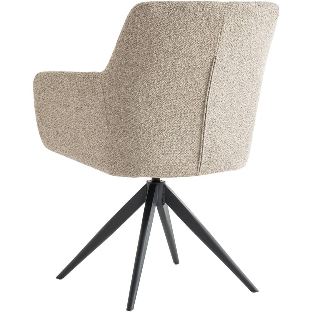 Wat de Vinta een bijzondere armstoel maakt, is de combinatie van unieke eigenschappen. Allereerst heeft de stoel een rank metalen onderstel met een automatisch terugdraaimechanisme, waardoor deze altijd netjes aan tafel staat en je makkelijk “uitstapt”. Een ander leuk detail is dat de stoel verkrijgbaar is in 3 kleurtjes in de prachtige boucléstof rhythm.