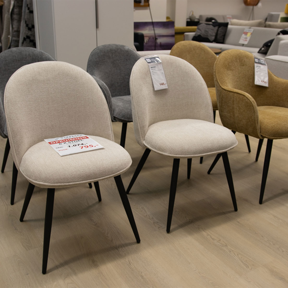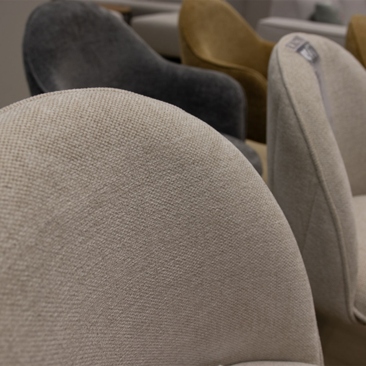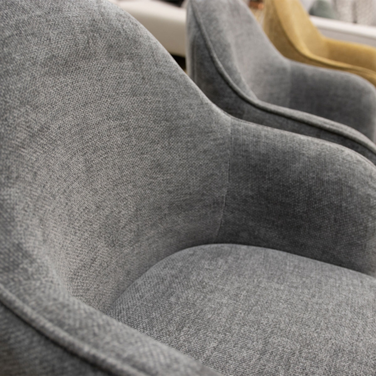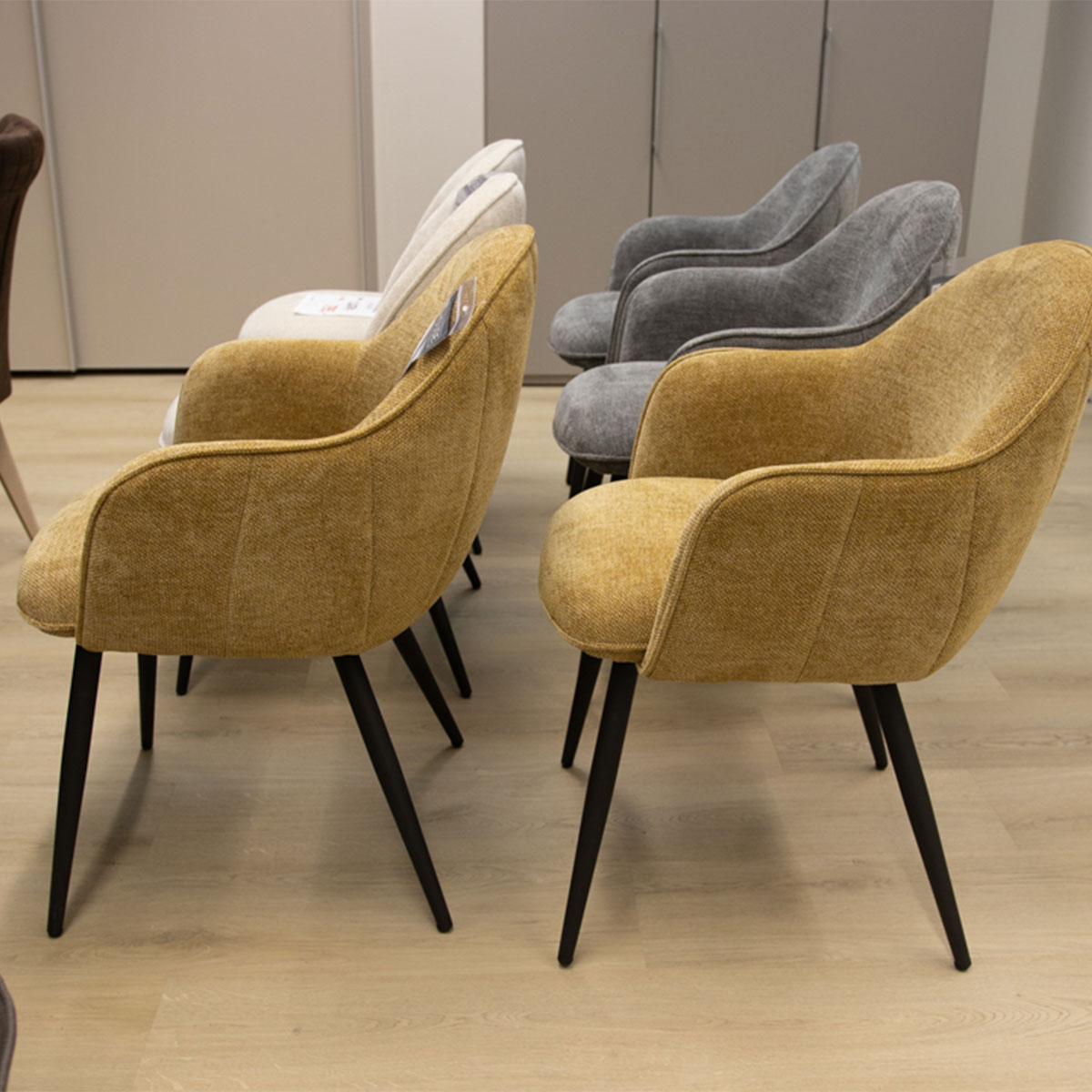 Uitgevoerd in stof Livigno met Zwart metalen poten. Combinatie van arm- en eetstoelen.