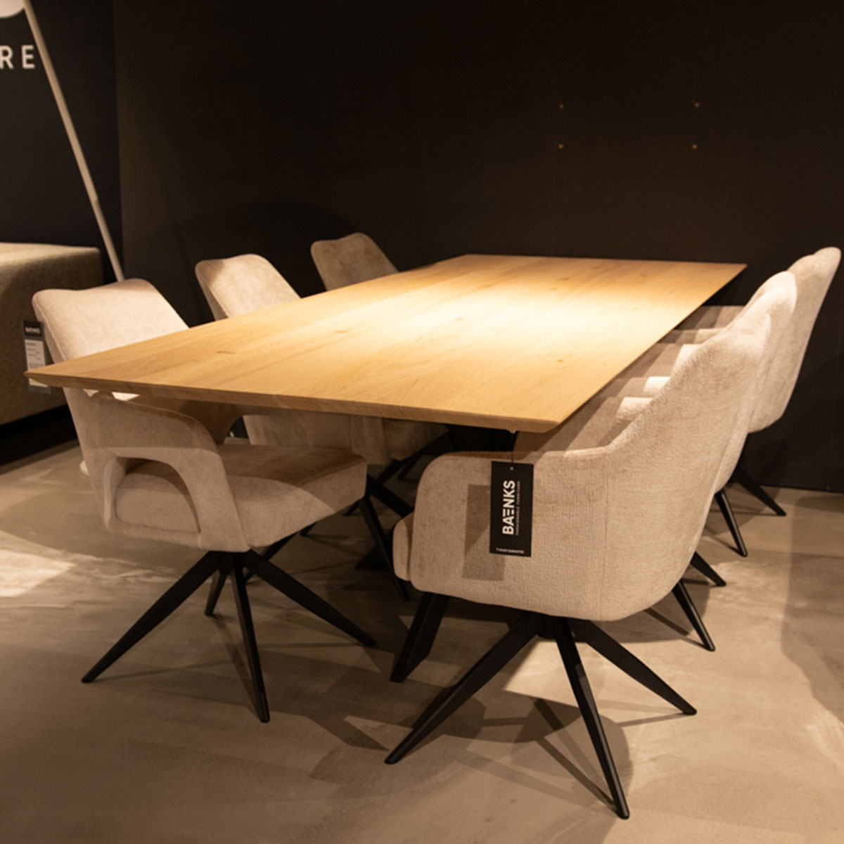 Eettafel met massief rechthoekig blad 3cm dik. Kleur Basic met verjongde bladrand en zwart metalen Mikado Slim poot.