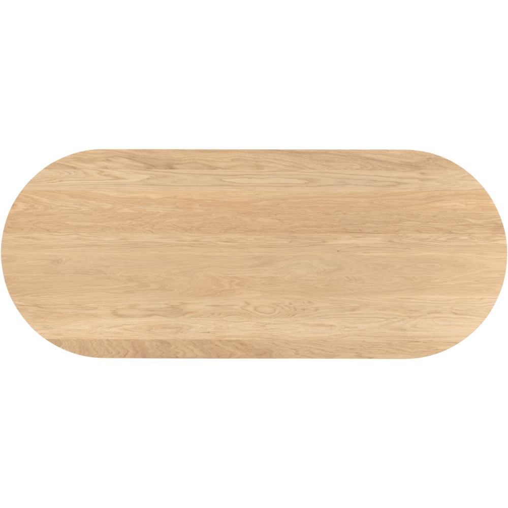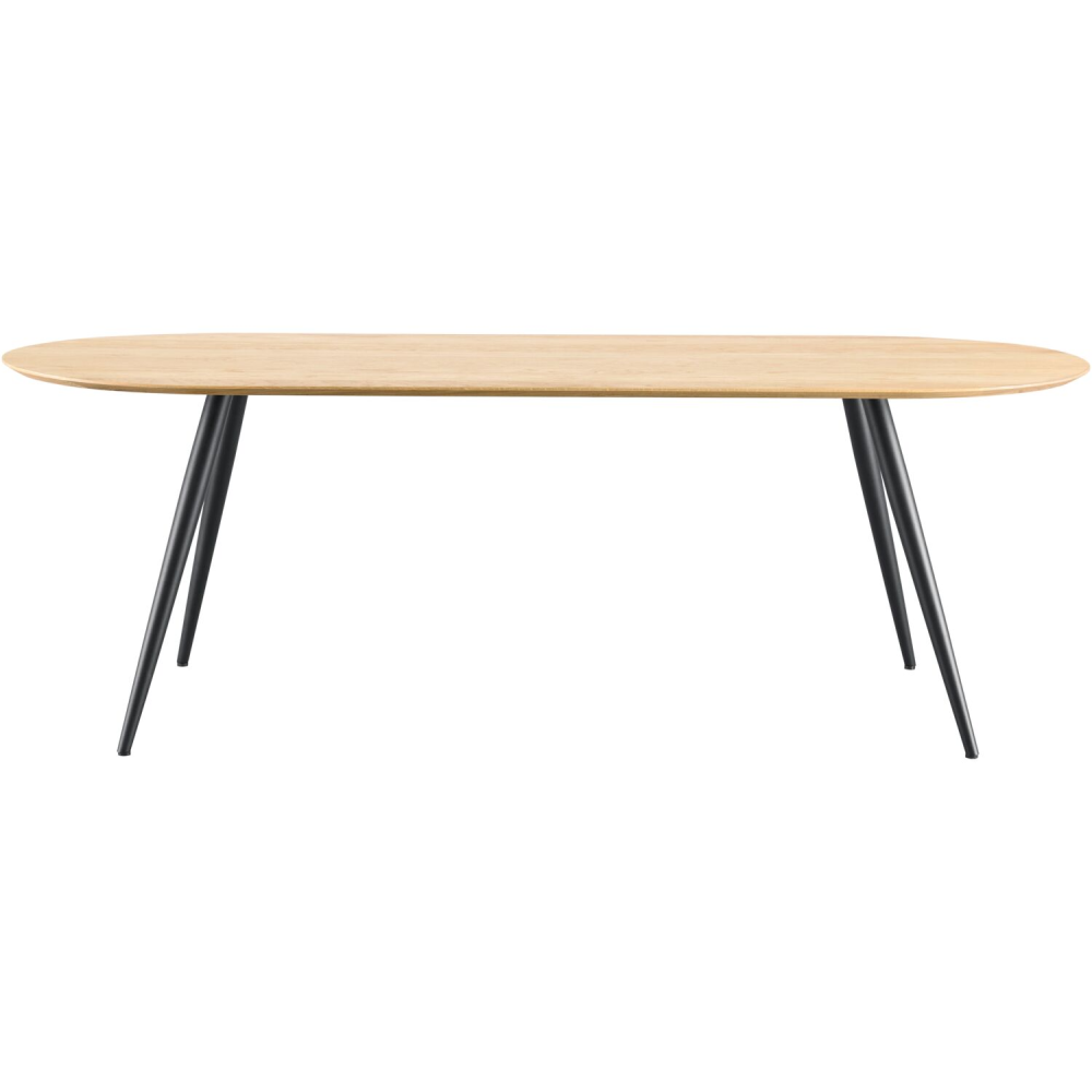 Eettafel Tabiro heeft een mooie ranke uitstraling en een tijdloos design zodat hij altijd in jouw interieur past. Het tafelblad is gemaakt van massief eikenhout en afgewerkt met een kleurlak. Het ovalen blad van deze uitvoering heeft een afgeschuinde bladrand. Het mooie naturelle bovenblad is voorzien van een transparante lak, om de natuurlijk uitstraling van het hout de behouden. Deze uitvoering is voorzien van slanke zwarte metalen 2-standen poten in een conische vorm, want de tafel een verfijnde look geef.