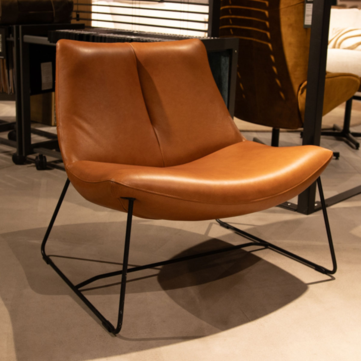 Fauteuil lage rug in leder Rebound. Kleur 23002 Cognac. Uitgevoerd met zwart metalen sledepoot.