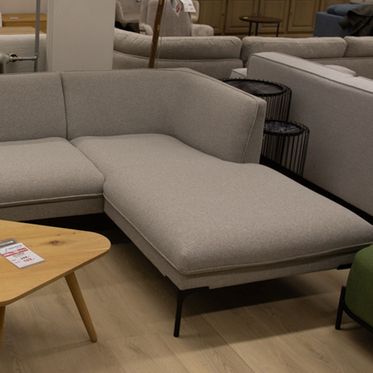 Uitgevoerd in stof Poem. Kleur 01 Natuur. Met zwart metalen poten. Samenstelling: 3 zits AL + Longchair AR.