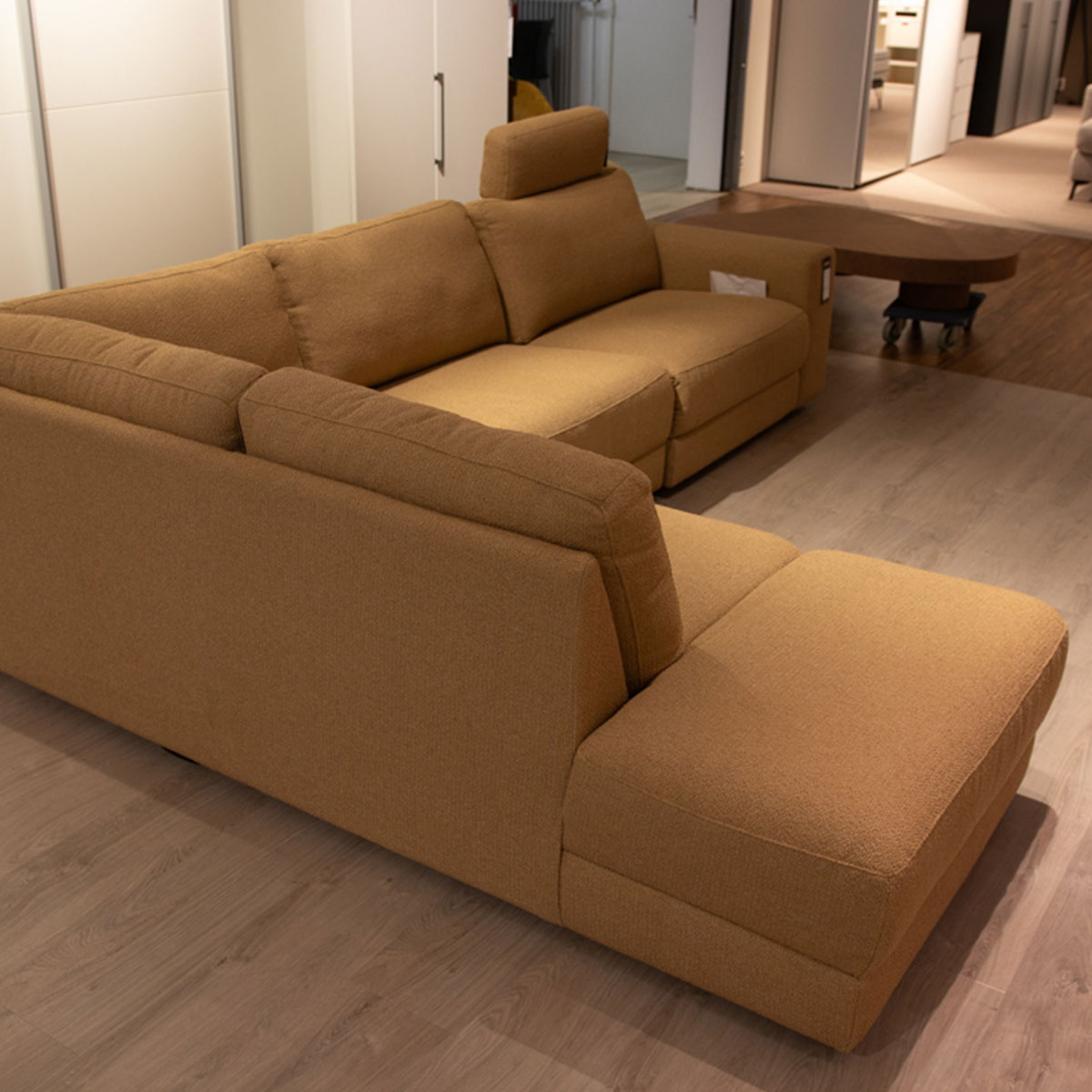 Showroom Greenwich met relax functie en hoofdsteun in Stof opera Caramel. Hoek met eiland links, 1,5-zits zonder armen, 1,5 zits met elektrische relaxfunctie, 1x hoofdsteun en zwarte kunststof poten 5cm