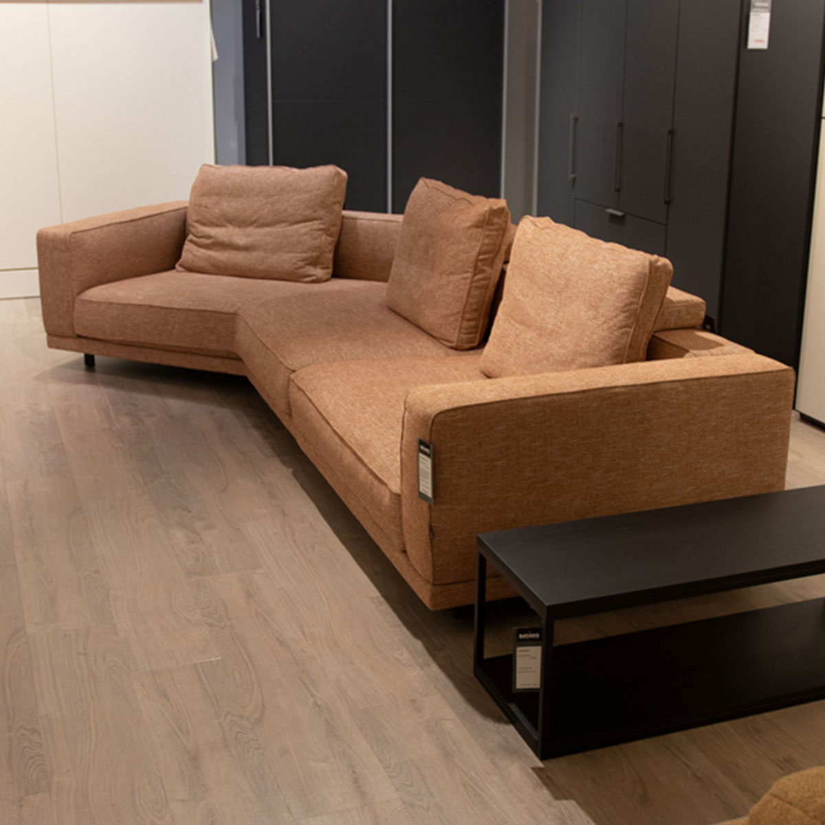 Hoekbank Hayes Valley lengte 383cm. 3 zits curved arm links + 2 zits arm rechts in stof Marsel (sg A) kleur Bronze (kleur 19) met comfort memory foam (CM) en zwarte metalen poten hoogte 10cm.