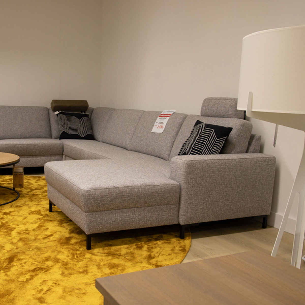 Hoekbank bestaande uit 3 zits armtype B links + hoek + 2,5 zits + longchair armtype B rechts. In stof Chrono (SG 04) 180-dolphin met bonellvering in de zitting en zwart metalen poten type MF4 (hoogte 12cm).