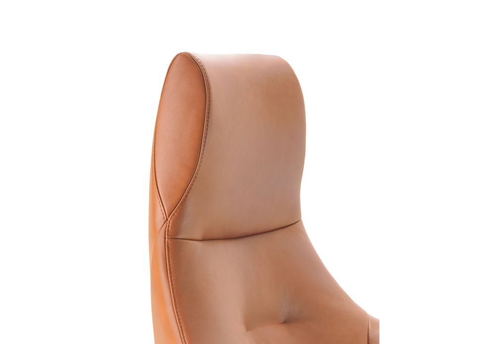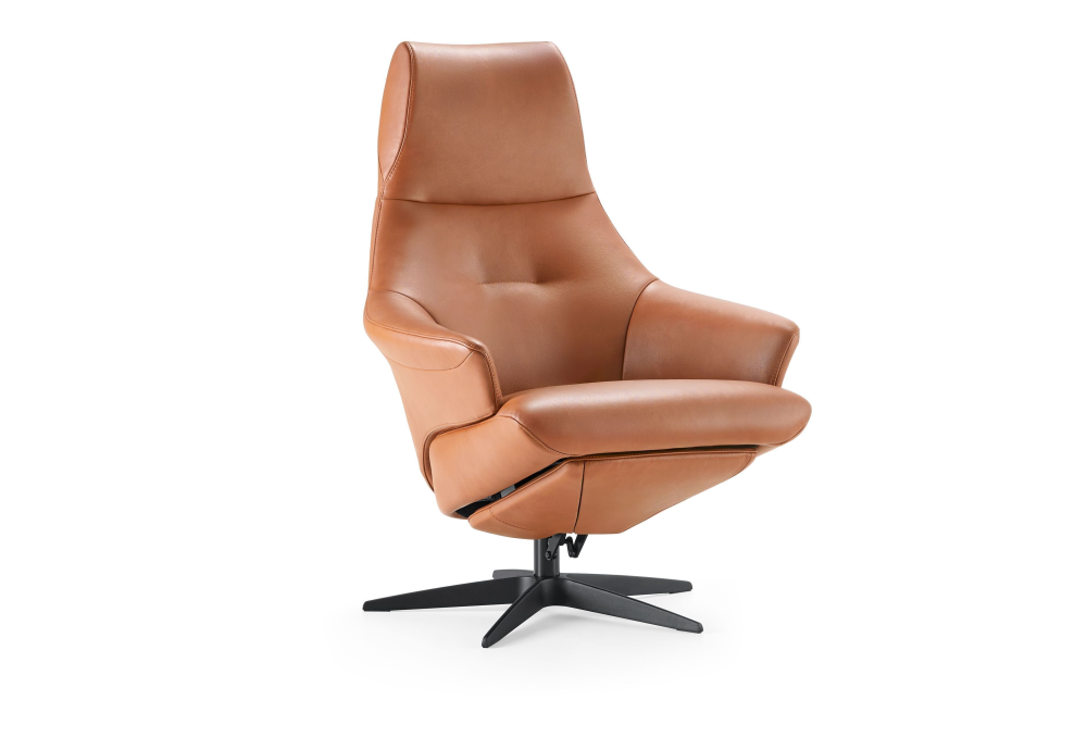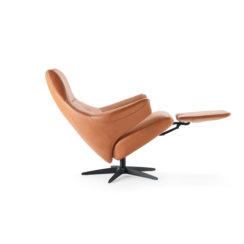 Deze relaxfauteuil straalt elegantie uit door zijn tijdloze design en verfijnde afwerking. Het rijke cognackleurige leder geeft een warme, luxe uitstraling, terwijl de hoge rug en geïntegreerde voetensteun uitnodigen tot pure ontspanning. Dankzij de slanke zwarte vijfteenspoot krijgt de fauteuil bovendien een moderne en luchtige touch en is het een echte eyecatcher in je woonkamer.