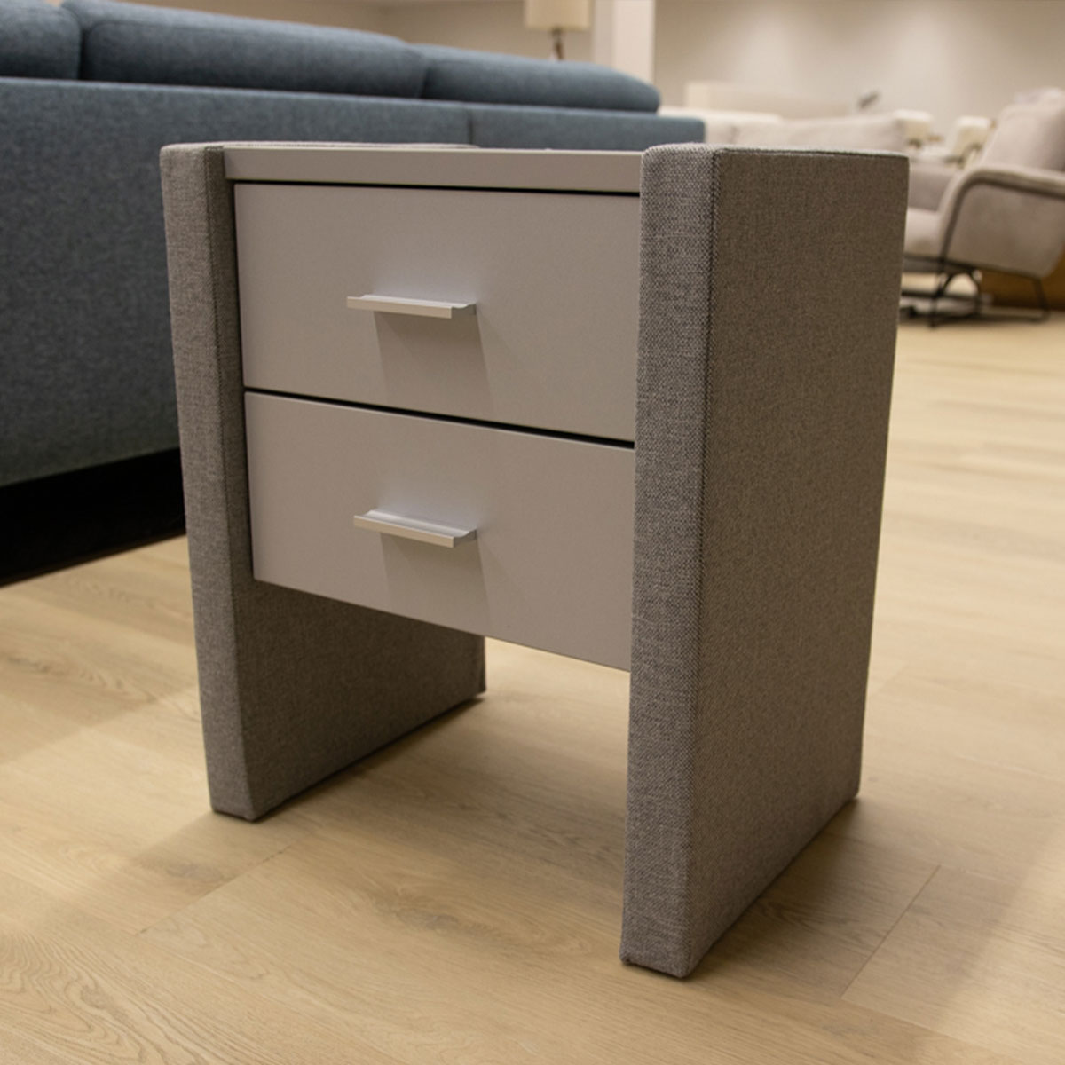 Nachtkastje stof met twee lades wit en handgreep in hoogte 60cm, breedte 40cm.