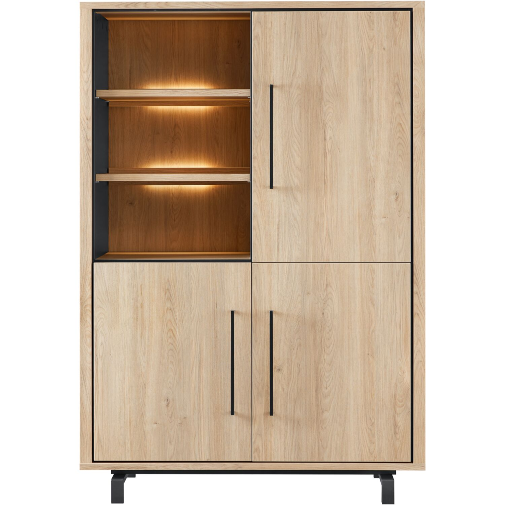Opbergkast Wesara is 110 cm breed en 160 cm hoog. De deurtjes zijn voorzien van zwarte handgrepen en de open vakken kunnen tegen meerprijs voorzien worden van LED-verlichting. Omdat deze kast onderdeel is van een kastenserie, is hij goed te combineren met andere meubels uit dit woonprogramma. Vraag naar de mogelijkheden in de winkel.