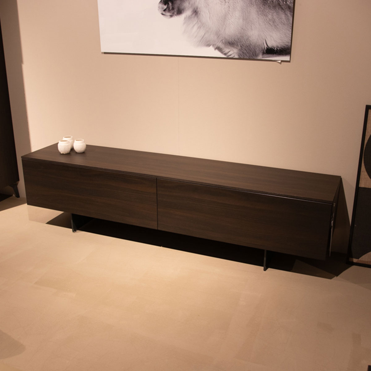 Uitgevoerd met 1 lade en 1 klep. In Ecowood Gessato Nero (melamine) en zwart metalen onderstel lama.