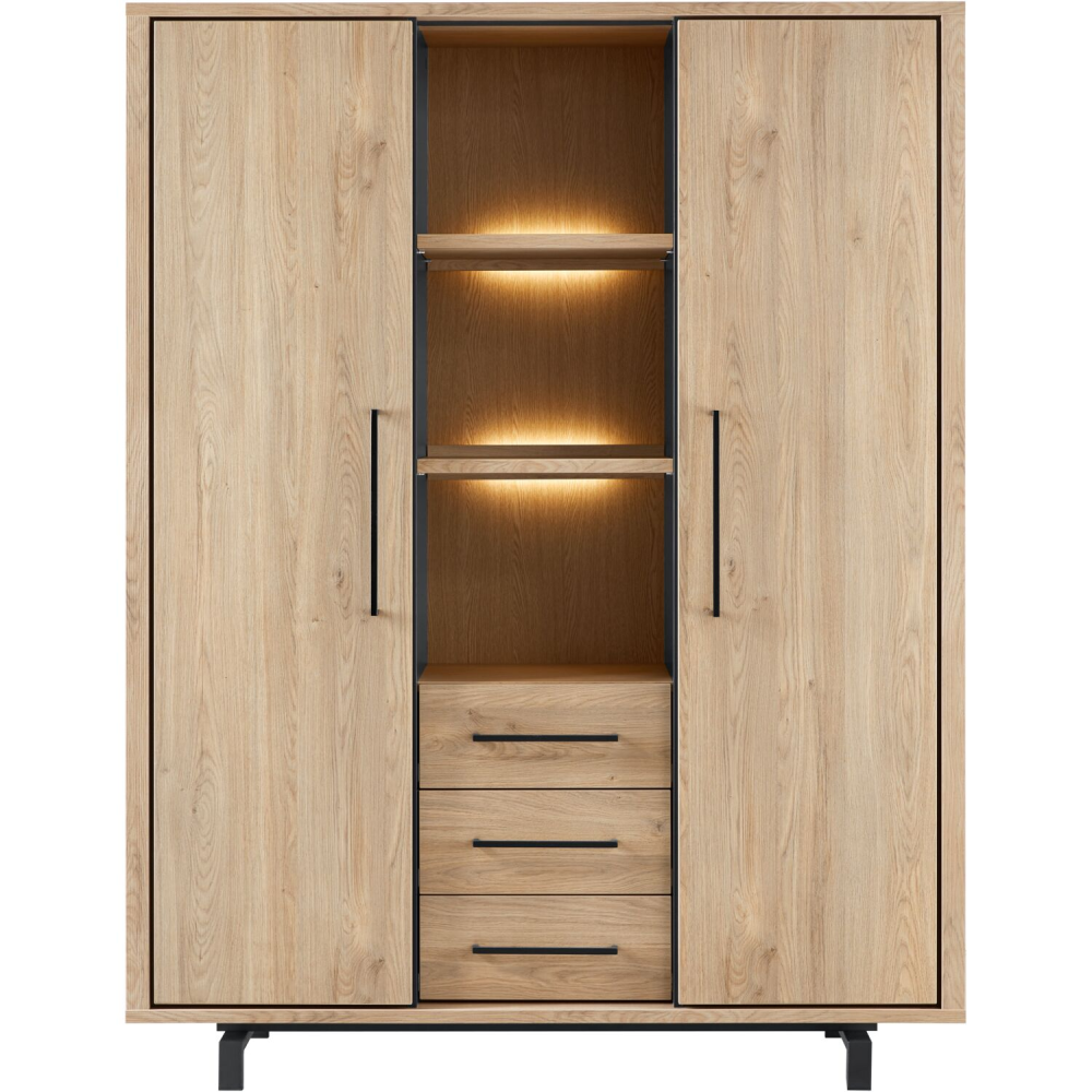 Wandkast Wesara is 135 cm breed en 175 cm hoog. De deurtjes en laden zijn voorzien van zwarte handgrepen en de open vakken kunnen tegen meerprijs voorzien worden van LED-verlichting. Omdat deze kast onderdeel is van een kastenserie, is hij goed te combineren met andere meubels uit dit woonprogramma. Vraag naar de mogelijkheden in de winkel.